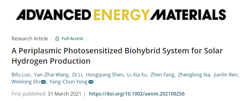 雍阳春教授团队与化工学院施伟东教授团队合作在Advanced Energy Materials杂志上发表最新研究成果“A periplasmic photosensitized biohybrid system for solar hydrogen production”。