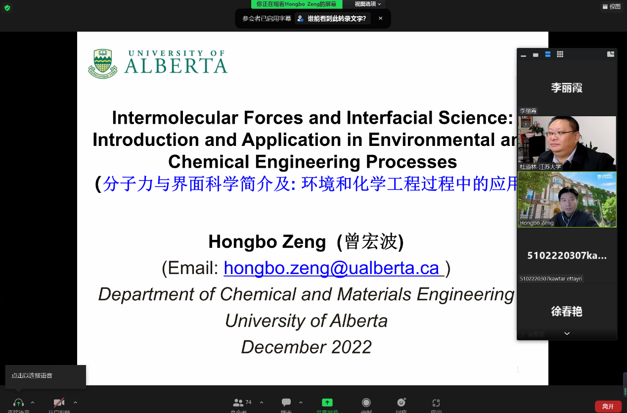 12月15日,阿尔伯塔大学化学工程和材料工程系终身教授、加拿大工程院院士、国家讲席教授、加拿大皇家科学院青年院士曾宏波受邀为院师生做题为“分子力与界面科学简介及在环境和化学工程过程中的应用”讲座。p站