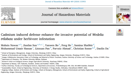 环境生态与修复团队孙见凡老师在Journal of Hazardous Materials (IF: 13.6)上发表最新研究成果“Cadmium induced defense enhance the invasive potential of Wedelia trilobata under herbivore infestation”。p站