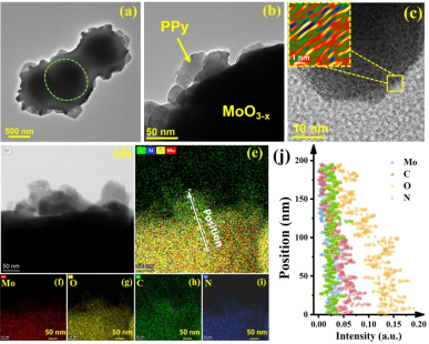 本研究通过简单的一锅法将聚吡咯原位聚合与MoO3-x的表面,形成了准核壳结构,在导电聚合物聚吡咯与MoO3-x之间构筑了有机-无机半导体异质结。通过改变前驱体吡咯单体的用量实现了对复合催化剂表面氧空位浓度的有效调控,为LSPR效应的增强提供了有效策略。Mo 3d空轨道与吡咯氮孤对电子之间通过共价键合形成的Mo-N界面化学键作为载流子迁移的通道,有效分离光生电子空穴对,并深入分析了二者之间有机-无机半导体异质结形成的机理。