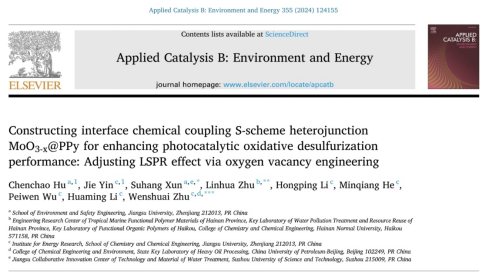 环境健康与生态安全研究中心荀苏杭老师在环境与能源TOP期刊《Applied Catalysis B: Environment and Energy》(SCI一区,IF = 22.1)上发表最新研究论文“Constructing interface chemical coupling S-scheme heterojunction MoO3-x@PPy for enhancing photocatalytic oxidative desulfurization performance: Adjusting LSPR effect via oxygen vacancy engineering”。p站