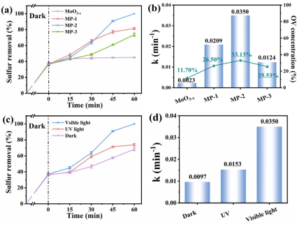 具备最佳氧空位浓度的复合催化剂在可见光下对H2O2氧化剂展现出了良好的活化性能,并实现了对模拟柴油中DBT的高效转化。该研究为利用光催化氧化技术进行柴油的清洁处理提供了新的思路与视角。