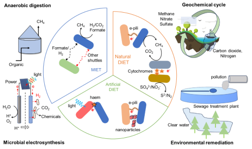 直接种间电子转移(DIET)是指微生物电互营共生过程中依赖于供电子菌株和受电子菌株之间的直接电子转移,从而帮助细菌在恶劣环境中生存的关键行为。研究发现微生物电互营可以实现低碳氮比废水中90%的硝酸盐去除,减少污水处理过程中50%以上的甲烷排放,其中DIET起着至关重要的作用。虽然直接的种间电子转移在促进地球化学循环和环境修复方面具有巨大的潜力,但其电子传递过程在实际应用中并不可控,主要原因是对直接种间电子转移机制的理解有限。
