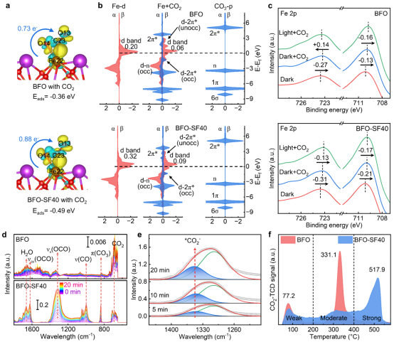 利用太阳能将二氧化碳光转化为有价值的化学产品是解决能源和环境问题一种有前景的策略。然而,强吸附的CO2会显著增加反应活化能来阻碍后续的反应。在此,本研究提出了一种具有晶格应变的BiFeO3材料,该材料协同调节金属位点和*CO2以及*COOH中间体之间的d/p-2π*轨道杂化,以实现强吸附CO2快速转化为关键的*COOH中间产物,加速整体CO2还原动力学。准原位X射线光电子能谱和原位傅里叶变换红外光谱结合理论计算表明,优化的Fe位点增强了CO2的吸附和活化作用,在光照条件下,内部电子迅速转移到反应位点并注入表面*CO2和*COOH,促进了*COOH的快速活化和稳定。