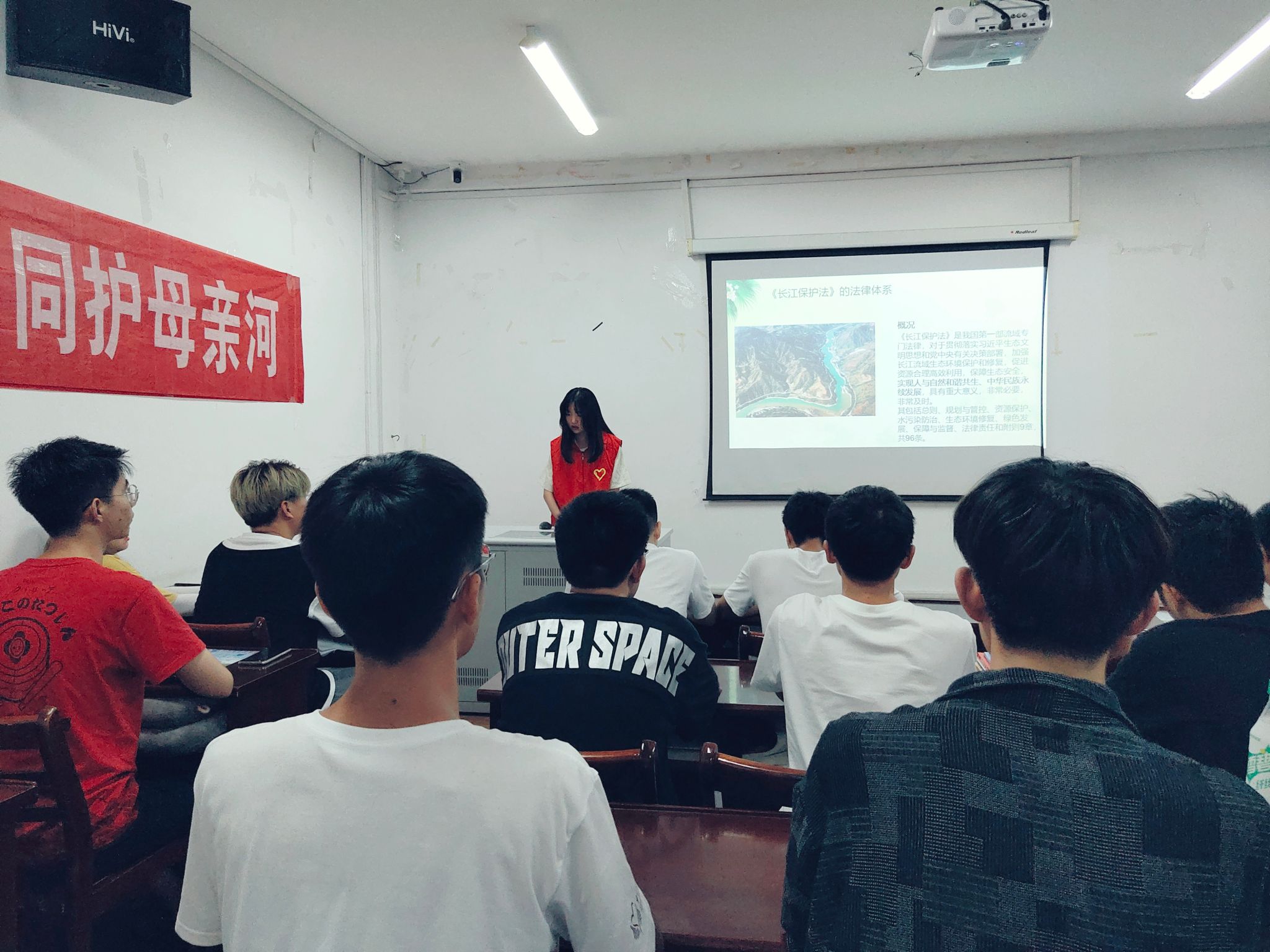 宣讲小组成员面向学校学生开展了以习近平生态文明思想、《长江保护法》和关于长江经济带发展战略思想为主要内容的宣讲会,让长江保护入耳入心。宣讲小组成员首先介绍了长江保护的法律体系,重点解读了《长江保护法》和镇江市的相关法律条文;然后对习近平生态文明思想进行了内涵解读,梳理了习近平总书记近几年的走访调研情况、相关省市生态文明建设情况,重点解读了习近平总书记多次长江沿线考察中的重要讲话和指示;最后志愿者对践行习近平生态文明思想和保护长江生态发出倡议。